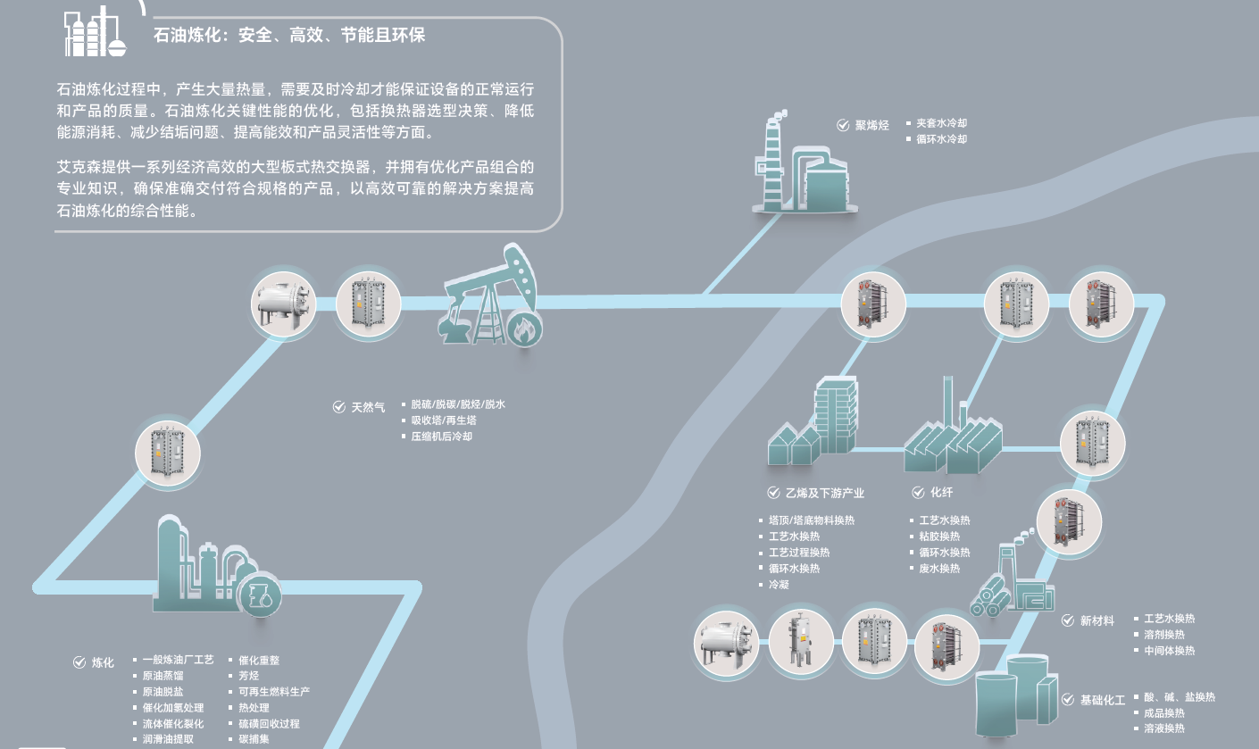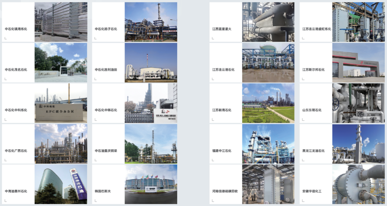 艾克森的換熱產(chǎn)品和應(yīng)用覆蓋了中石油、中石化等企業(yè)的各個(gè)下屬單位,還包括非三桶油的各類地?zé)捄褪髽I(yè)、包括中化泉州、中海殼牌、恒逸石化、盛虹煉化、衛(wèi)星石化、桐昆石化、寧波金發(fā)、煙臺(tái)萬華、山東聯(lián)泓、東明石化、魯清石化、中景石化、翔鷺石化、華錦阿美等知名企業(yè)的各個(gè)工藝段。