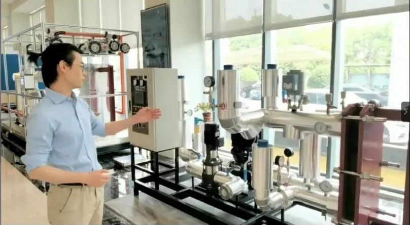 跟隨鏡頭,艾克森技術(shù)支持徐工,帶領(lǐng)大家走進(jìn)艾克森產(chǎn)品展廳,通過(guò)視頻徐工介紹了展廳內(nèi)的主要產(chǎn)品:模塊化機(jī)組——根據(jù)客戶的需求進(jìn)行組合,可以于供熱,暖通空調(diào)和一些工業(yè)場(chǎng)合。